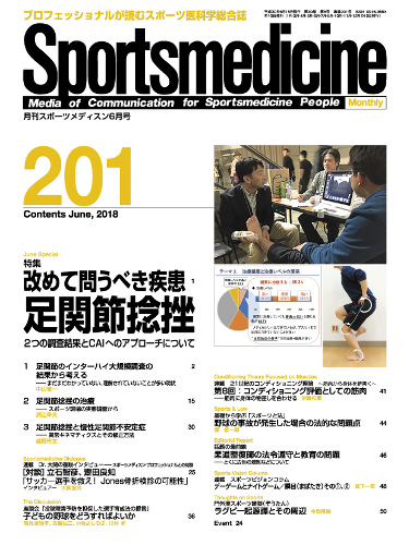 足関節捻挫はスポーツ現場では日常茶飯事であるが、「古くて新しい外傷」ということができる。今回の特集はこの足関節捻挫にスポットを当て、改めて調査した2つの結果を詳しく紹介し、慢性足関節不安定症と訳されるCAIについての論考を掲載する。2つの調査結果はスポーツ選手のためのリハビリテーション研究会主催の第35回研修会で発表されたものだが、編集部で改めて資料を見せていただきながらインタビューしてまとめたものである。